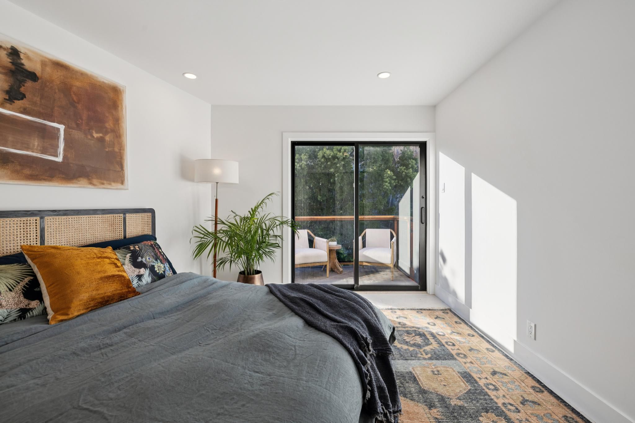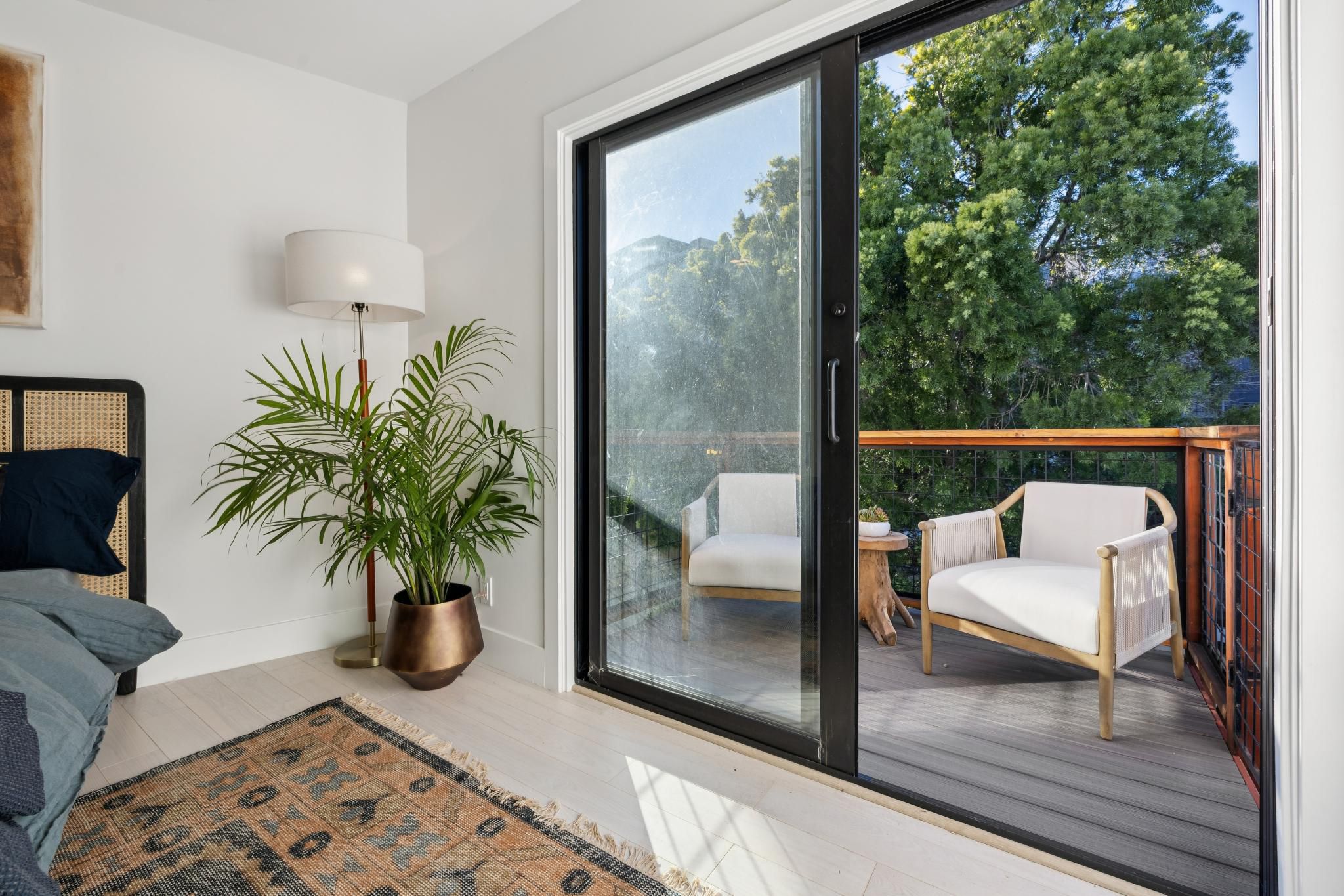 The living area extends effortlessly into the outdoors via a direct connection to the unit's primary exterior feature.